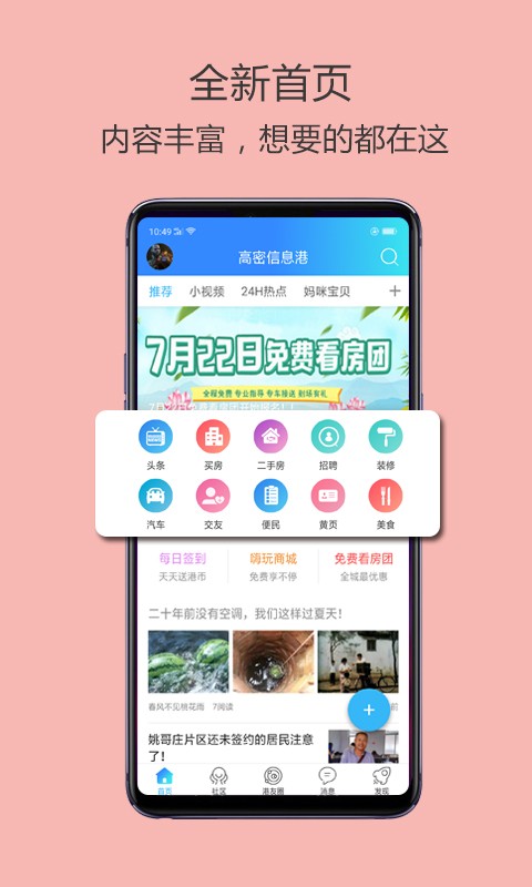 高密信息港是一款专为高密本地居民设计的本地生活社区平台。在这里,用户可以轻松获取本地资讯、房产租售、招聘求职、二手转让等各类信息。只需简单刷新当前位置,即可智能推荐周边美食与商家信息,让用户轻松发现感兴趣的帖子内容,并关注特定话题以获取更多有趣的信息。此外,平台内置生活、房产、交友等话题圈子,鼓励用户分享有趣见闻,构建了一个适合高密市民自由交流的平台,极大地丰富了市民们的日常生活娱乐选择。 软件特色包括: 1. 实时更新并推送精彩动态,让用户随时掌握最新资讯,一键即可深入了解。 2. 不定期更新的视频内容,确保用户不会错过任何有价值的信息,随时掌握时事热点。 3. 聚集大量同城好友,用户可以随时发起和参与话题讨论,构建紧密的社区联系。 软件亮点有: 1. 实时展示周边美食餐厅信息,便捷选择餐品并下单,享受美食体验。 2. 及时查看周边最新动态信息,针对问题迅速作出调整,保持与时俱进。 3. 展示周边发布的精彩图文资讯,用户可任意点击查看,丰富阅读体验。 软件优势在于: 1. 作为高密人必备的本地生活服务软件,提供一站式本地生活服务平台。 2. 丰富的求职招聘、同城交友、二手市场等板块,满足用户多样化需求。 3. 软件涵盖高密新闻、汽车资讯、商家优惠等信息,吃喝玩乐一应俱全。 高密信息港布租售房信息教程: 1. 打开高密信息港app,点击“二手房”。 2. 点击“我的出租”即可发布。 软件点评:高密信息港是专为高密市民打造的本地生活信息服务平台,汇聚租房、汽车、美食、二手市场以及求职招聘等实用信息。无论是了解市场动态还是寻找就业机会,这里都是高密市民们不可或缺的软件。