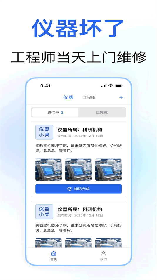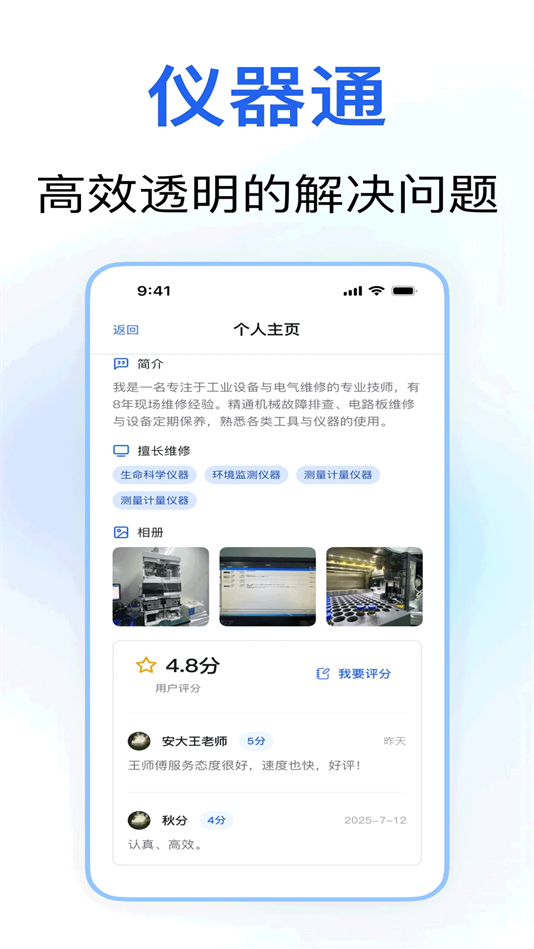 仪器通APP:一站式仪器维修解决方案 仪器通APP是一款专为仪器维修设计的接单平台,旨在为用户提供高效、专业的维修服务。用户只需轻松发布订单,即可迅速获得专业工程师的响应,解决各种难题。平台汇聚了行业上下游的丰富资源与最新资讯,提供全方位、一站式服务,确保维修工作顺利进行。 对于工程师而言,仪器通APP是一个增收良机。凭借专业技能,他们可以在平台上快速接单,实现高效维修,精准匹配供需双方。我们致力于确保维修质量可靠,实现双赢。 软件简介: 仪器通利用互联网技术,整合仪器设备资源,构建全国性的售后服务网络。我们致力于为用户提供快速、专业且成本效益高的维修服务,同时帮助工程师更便捷、高效地接单。 使用方法: 1. 下载并安装APP后,等待软件加载启动。 2. 阅读用户协议和隐私政策,同意并继续。 3. 开启应用,输入手机号码注册或登录。 软件特色: 1. 实时沟通:用户和工程师可即时交流,确保信息畅通。 2. 快速响应:仪器出现故障,工程师当天上门维修。 3. 高效透明:问题处理过程清晰,结果一目了然。 4. 订单丰富:工程师可接收大量订单,增加收入。 软件特点: 1. 方便快捷:快速找到附近工程师,即坏即修。 2. 成本降低:简化流程,减少维修成本。 3. 订单稳定:业务覆盖广泛,订单源源不断。 4. 功能聚合:提供安装、维修、维护等一站式服务。 5. 免费入驻:用户与工程师均可免费加入。 软件功能: 1. 仪器维修订单全网展示,工程师就近接单。 2. 用户发布订单后,系统自动匹配最合适的工程师。 3. 信息透明化,促进直接沟通。 4. 构建口碑:多维度展示工程师的服务数据,树立良好口碑。 更新日志: 仪器通APP持续升级,依托互联网技术整合仪器设备资源,为用户提供更快捷、更专业的维修服务。同时,我们致力于帮助工程师更高效地接单,共同推动仪器维修行业的便捷化发展。
