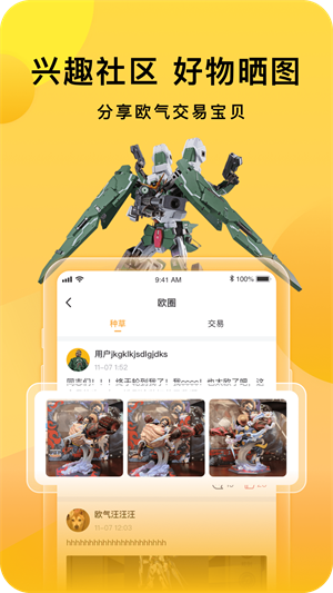 欧气赏是一款专为二次元爱好者设计的盲盒购物平台,汇集了高达模型、动漫手办、周边商品以及各类数码设备的盲盒,用户可根据个人喜好挑选心仪的盲盒进行购买。线上抽取的盲盒均为有货状态,且所有商品均经厂家授权,确保正品,让您可以安心购买。此外,若您抽中不喜欢的商品,还可进行退换操作,积累的退换积分更可直接兑换您喜爱的商品。 软件概述 这款电商社交平台因其独特的交易互换规则而备受瞩目,它不仅仅是一个购物平台,更是一个交流与分享的空间,让每一位用户都能在这里找到属于自己的乐趣。