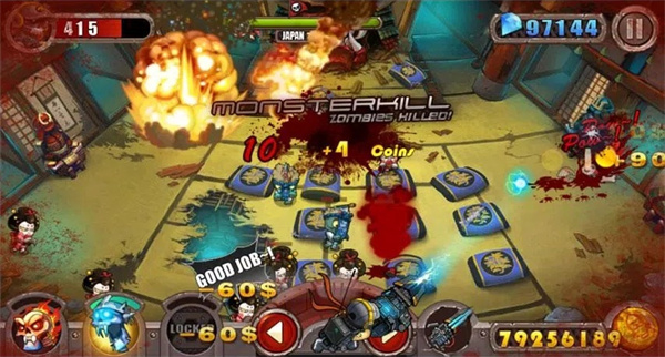 《暴击僵尸》是一款以打僵尸为主题的枪战射击游戏,让玩家化身为神枪手,在这个僵尸肆虐的世界中,唯有手中的枪械是最可靠的伙伴与安全的保障。玩家在固定位置进行定点射击,只需利用机枪对僵尸进行扫射。每位玩家可以从地狱使者、冰王、核弹等技能中选择一项使用,在持续攻击的过程中积累能量条,一旦能量条满,即可释放强力大招。 游戏特色: 1. 采用固定视角为玩家呈现2.5D画面下的僵尸射击大战,操作简便,仅通过触屏即可完成控制。 2. 扮演游戏清道夫的角色,与各类僵尸展开激烈对抗。游戏中为玩家提供了多样化的武器选择。 3. 玩家被固定在防御墙内,需要抵御来自四面八方的僵尸攻击,并予以反击。 游戏亮点: 1. 随着游戏进程,玩家可以不断提升自身属性,包括增加血量、增强防御以及提升躲闪能力。 2. 游戏中设有威力巨大的道具,使战场上的战斗更加激烈且令人眼花缭乱,是一款非常出色的休闲射击游戏。 3. 丰富的武器系统,包含14种经典枪支,让玩家享受爆头和碾压的快感,看着僵尸在炮火中灰飞烟灭。 游戏优势: 1. 6大守卫与5大技能供玩家选择,多种搭配与升级路线,让玩家在僵尸吞噬脑浆前找到求生之路。 2. 场景丰富且特效惊艳,作为幸存的雇佣军,战斗是唯一的出路,而弹药则是活下去的希望。 3. 游戏涵盖3大地域、21张经典场景地图以及126个丰富的战斗关卡,让玩家在混沌的时间与空间中穿梭,横扫一切障碍。 总的来说,《暴击僵尸》是一款以美式漫画风格呈现的快节奏射击冒险游戏。玩家在闯关时需要根据枪械情况做出合理应对,有的关卡敌人数量众多但血量较低,此时可以选择装备地狱使者守卫技能,其效果类似于燃烧弹,能对大范围内的僵尸造成AOE攻击。