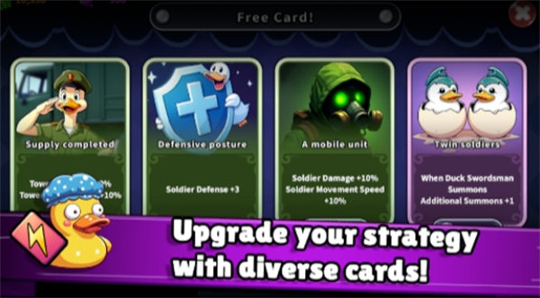 What Duck是一款以鸭子为主角的全新塔防游戏。其画风温馨可爱,角色设计精致细腻,每一只鸭子都独具特色,呈现出一种Q萌卡通风格,让玩家在游戏中感受到轻松愉快的氛围,且适合各年龄段的玩家。游戏玩法简单有趣,需要解锁并构建多样化的防御塔,每个防御塔的攻击范围都有所不同。 游戏特色: 1. 丰富的塔防玩法,提供多样的防御单位选择,需要玩家精心规划布局和资源分配,以提升防御能力。 2. 面对众多不同类型的敌人,需要灵活应对,考验玩家的策略布局和实时反应能力。