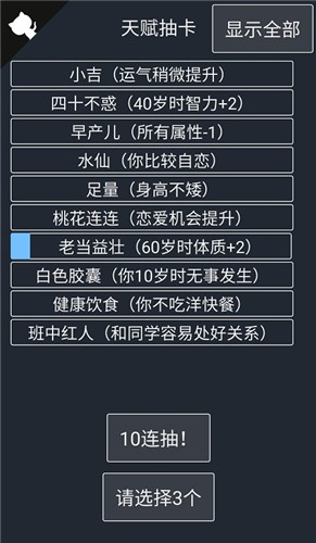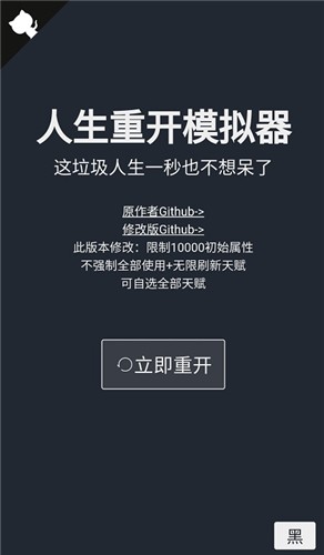 《人生重开模拟器爆改版》是一款极具魔性且富有乐趣的文字剧情游戏,它是原版《人生重开模拟器》的极致改良版本。在这个版本中,玩家将享受到前所未有的初始优势——所有属性直接+99999,彻底告别所有随机死亡事件,同时,一系列全新的天赋供玩家自由挑选,使得人生发展充满无限可能,为玩家带来前所未有的游戏乐趣和全新的游戏体验。
